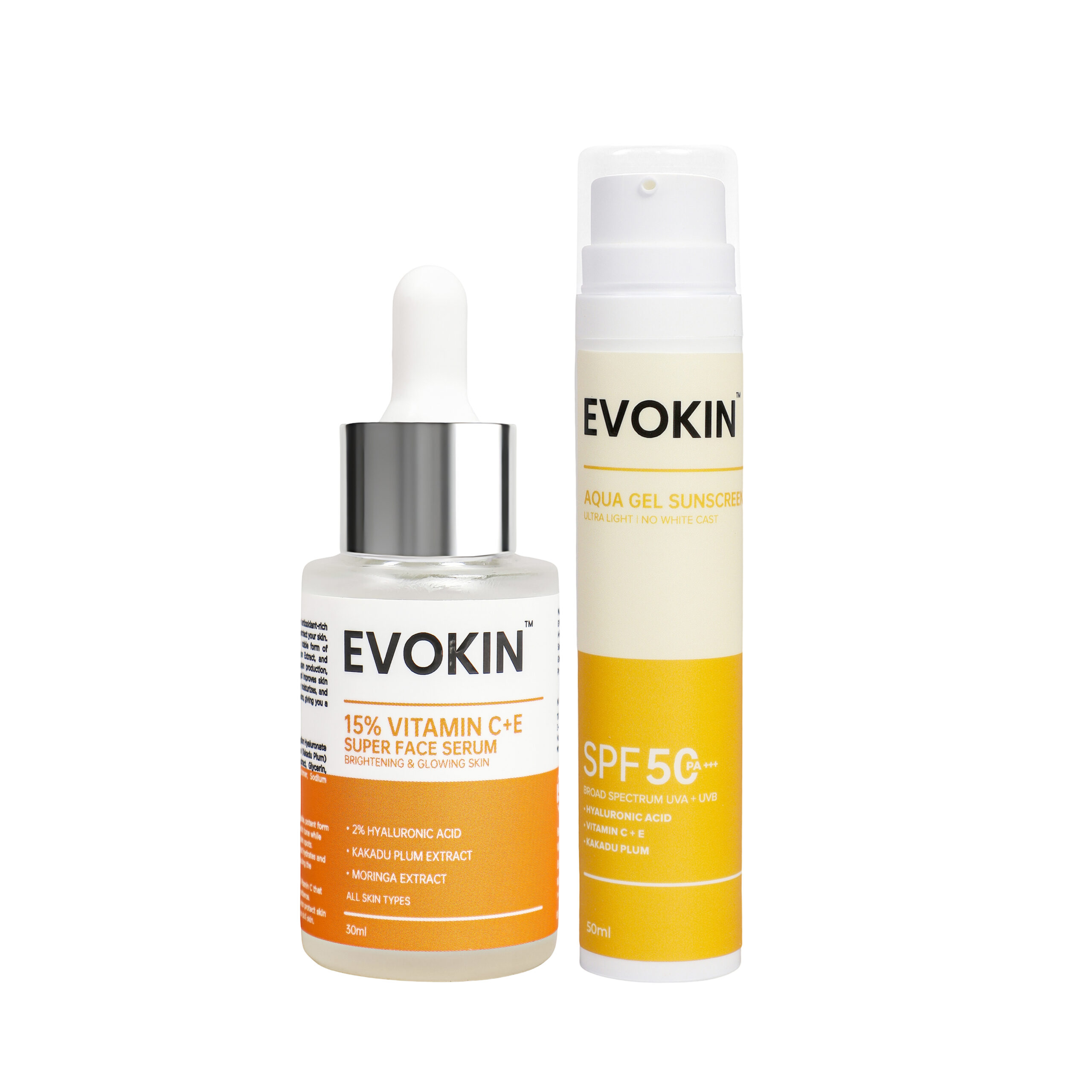 Here are benefits of using the 15% Vitamin C face serum and Evokin Aqua Gel Sunscreen as a combo: